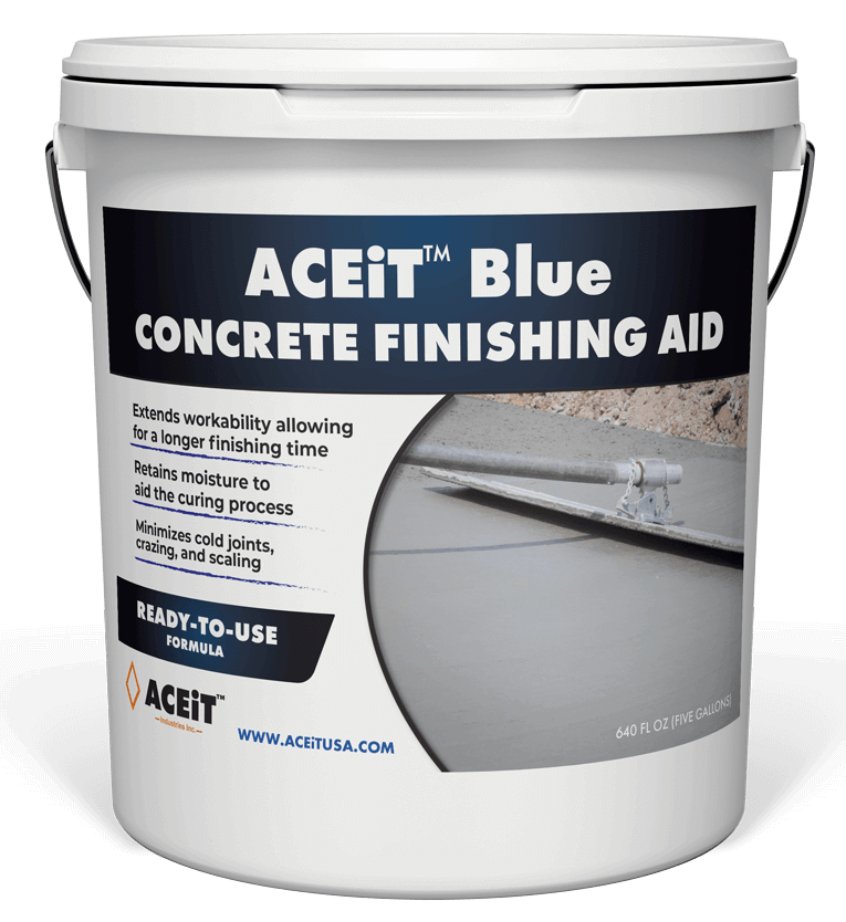 ACEiT Blue finishing aid is a spray-on additive that makes concrete flatwork finishing easier and faster, producing better results and reducing the risk of premature setting. Applied while floating or troweling, ACEiT Blue extends the time needed to finish concrete under dry and windy conditions.