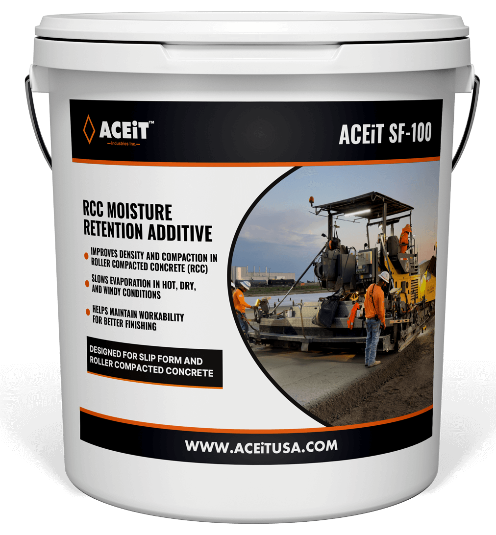 ACEiT SF-100 is a proprietary admixture specifically designed to reduce water while serving as a hydration stabilizer in regular concrete and cold-weather concreting. Improves density and compaction in Roller-Compacted Concrete and Cement-Treated Bases.