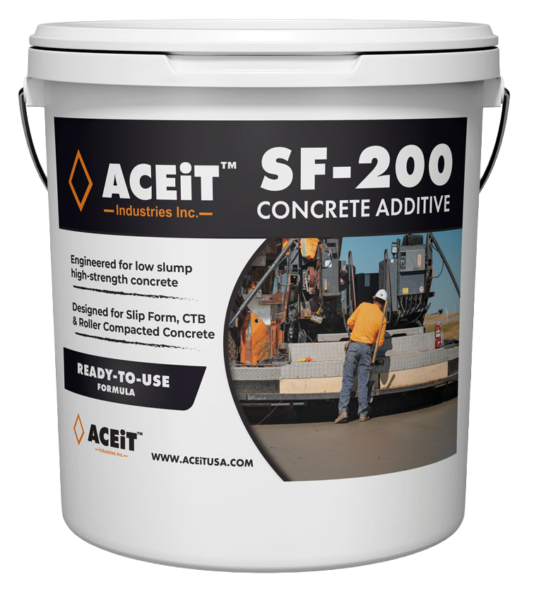 ACEiT SF-200 is a proprietary ready-to-use concrete admixture, specifically engineered for all concrete including low-slump/high-strength concrete, compactable/slip form concrete, Roller Compacted Concrete, and cement treated bases. It has been scientifically engineered to stabilize phase II cement hydration, affording the end user greater open time for the concrete mixture.